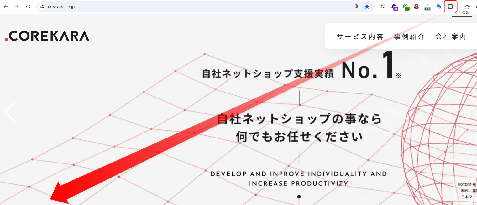 ④ 設置有無の確認を行いたいショップページをGoogleChromeで開き、画面右上に表示される拡張機能を押してください。