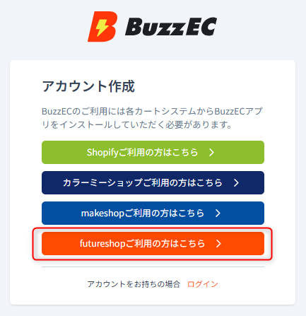 ① https://user.buzzec.jp/register より「futureshopご利用の方はこちら」を選択してください。
