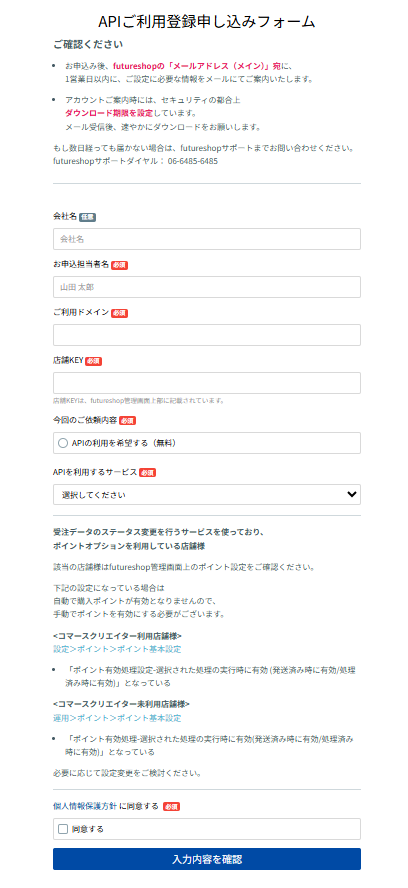 ⑤ フォーム申請後、1~2営業日でフューチャーショップ様よりAPI情報のメール※が届きます。