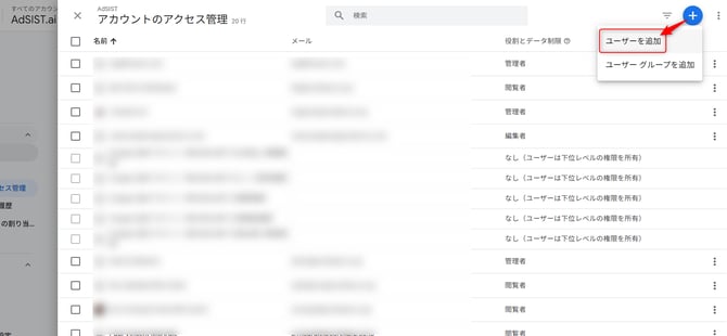 ④ 画面右上に表示される「+」を押し、「ユーザーを追加」を押してください。