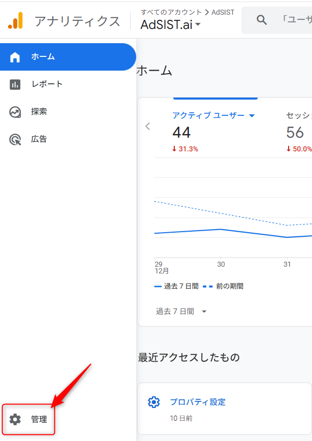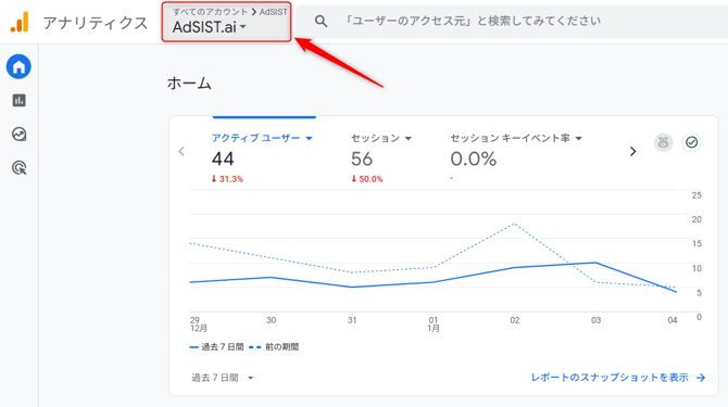 ②(アカウントが複数ある場合)左上から該当のアカウントとプロパティを選択してください。