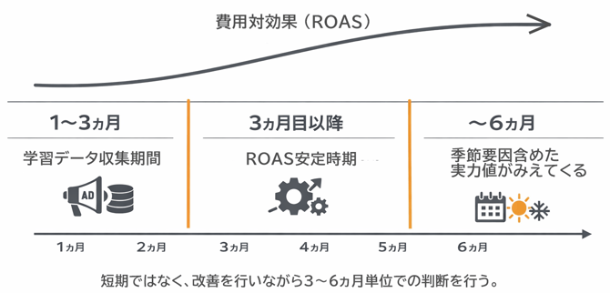最初の3ヵ月は学習を育てる期間と位置付け、画像やキャッチコピーなどの改善を行いながら様子を見ていただくことを推奨いたします。その後、さらに6ヵ月スパンで見れば、季節要因やセール施策などの結果もならされ、より実力値に近いROASが見えてきやすくなります。