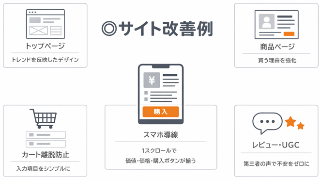 特にアパレル・食品・雑貨などは、LPや商品ページの説得力・FAQ・レビュー・送料・納期の明確さ等で購入率が大きく変わります。