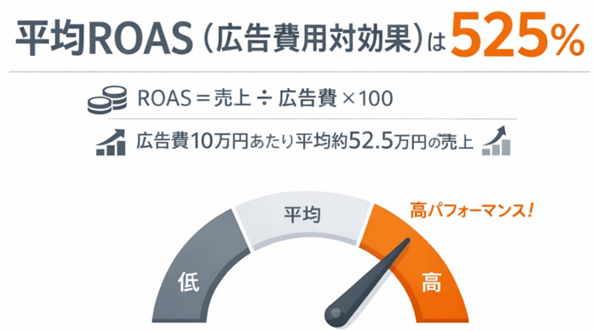 ROASとは「売上÷広告費×100」で表す指標です。つまり、利用料が10万円の場合、平均すると約52.5万円の売上が発生した計算になります。