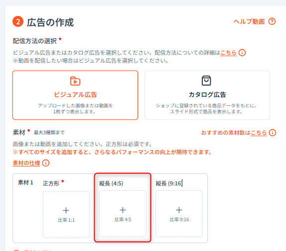 2026/03/18 【Meta】サイズの追加 アップデート内容 2026.03.18 このたび、Metaのビジュアル広告で登録できる画像のサイズが追加されました。 下記のとおり、縦長(4:5)のサイズに対応しています。 各登録画像や動画の推奨サイズについては下記をご確認ください。 【Meta|ビジュアル】素材(画像/動画)の規定について