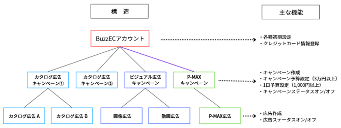 下記イメージ図の2階層目のとおり、広告の土台となるキャンペーン(※3)の作成が完了するタイミングで、ご登録済みのクレジットカードから決済(最低30,000円)を行っていただきます。
